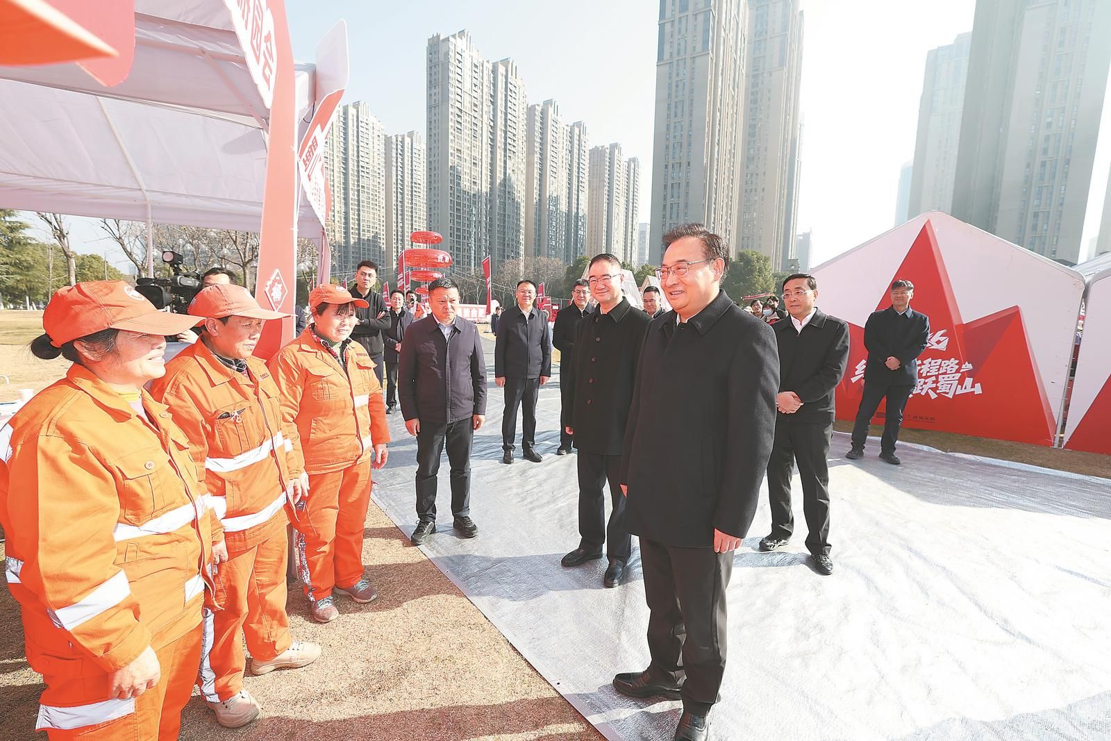 2月14日上午,省委书记梁言顺、省长王清宪在合肥市蜀山区绿轴公园,向在这里值守的环卫工人表示慰问。本报记者 杨竹 许昊 摄