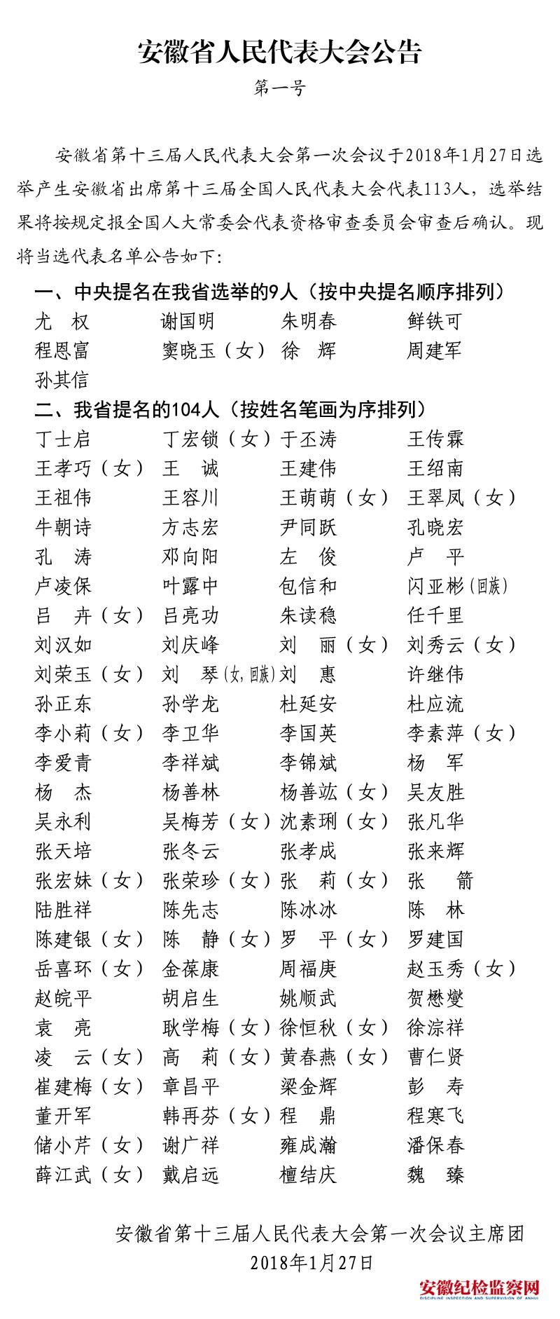 安徽省出席第十三届全国人民代表大会代表名单公布