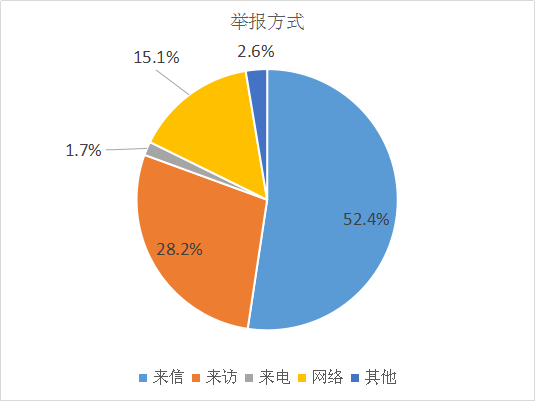 从举报方式看,来信、来访成为群众反映问题的主渠道。其中:来信184件,占52.4%;来访99件,占28.2%;来电6件,占1.7%;网络53件,占15.1%,其它9件,占2.6%。