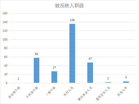 从被反映人职级看,检举控告中反映农村人员的占比最大,其中涉及乡科级干部58件;涉及一般干部27件;涉及县处级干部1件;涉及农村人员136 件;涉及事业单位人员47件;涉及国有企业人员2件;涉及其他人员4件。