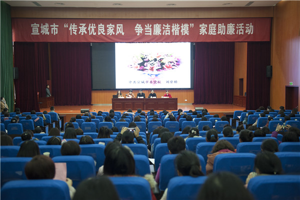 “千里之堤,溃于蚁穴。广大女干部要经常‘吹廉风’‘念廉经’‘把廉脉’‘敲廉钟’,时常提醒自己的家人防微杜渐,坚决抵制各种腐败和不正之风的诱惑,当好廉洁家庭的‘守门员’”。今年“三八”国际劳动妇女节当天,宣城市纪委联合市委组织部、市妇联向全市广大女干部发出家庭助廉倡议。